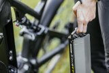 Detailaufnahme davon, wie ein integrierter Akku aus dem Rahmen eines E-Bikes entnommen wird.