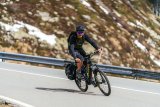Draufsicht auf zwei Personen, die auf Fahrrädern mit Gepäck auf einer Straße fahren.