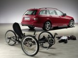 Eine Frau mit einem zusammengeklappten Liegerad in einem Zug.