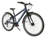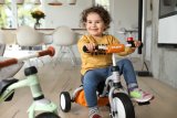 Eine Frau fährt auf einem E-Lastenrad mit Kinderanhänger quer über eine Straße. Im Hintergrund ist der Berliner Fernsehturm zu erkennen.