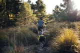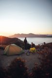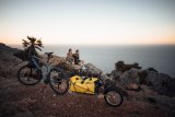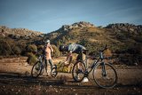 Eine Frau und ein Mann fahren lächelnd mit bepackten Fahrrädern vor einer entfernten Bergkulisse in offener Landschaft entlang.