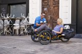 Das Hinterrad eines Liegerades auf Kopfsteinpflaster.