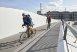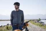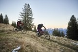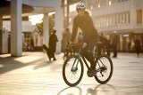 Eine Gruppe Radfahrer:innen mit deutlich sichtbarer Beleuchtung fährt bei Dunkelheit auf einer Straße auf die Kamera zu.