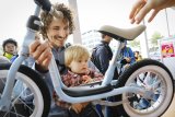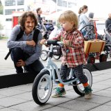 Ein Kind mit einem Laufrad vor einem Mann mit einem historischen Laufrad aus Holz.