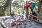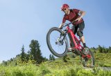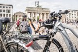 Ein Mann steht neben einem E-Bike in einem Montageständer. In der Hand hält er einen Laptop, der über Kabeln mit dem Rad verbunden ist.