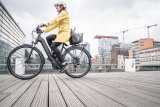 Eine Frau sitzt neben einem abgestellten E-Bike auf einer Bank und schaut lachend auf ein Smartphone.