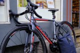 Eine Person schiebt ein Fahrrad über einen Fußgängerüberweg und schaut zu einem Polizeiauto auf der Fahrbahn.
