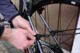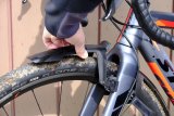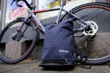 Ein Lastenradfahrer überquert eine Straße innerhalb einer Fahrbahnmarkierung. Ein Auto wartet im Hintergrund.