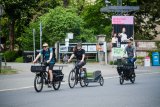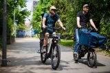 Ein Radfahrer auf einem Lastenrad und einer mit Anhänger fahren nebeneinander eine innerstädtische Straße entlang.