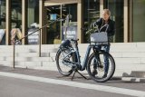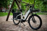 Ein Mann fährt ein Lastenrad mit zwei Kindern an Bord. Hinter ihm ist eine Frau auf einem E-Bike unterwegs.