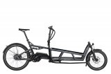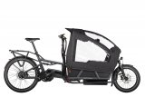 Ein Mann fährt ein Lastenrad mit zwei Kindern und Regenverdeck.