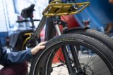 Detailaufnahme eines E-Bike-Rahmens mit einem Aufkleber, der auf einen GPS-Tracker hinweist.