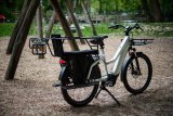 Zwei Personen auf Lastenrädern fahren nebeneinander.