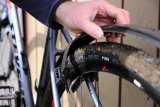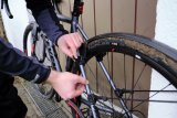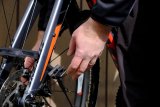 Eine Frei steigt mit einem E-Bike mit kleinen Rädern in einen Zug ein.