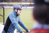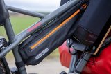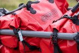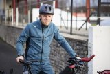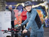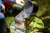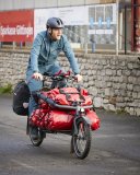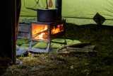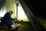 Am Rand eines Feldes steht ein Pyramidenzelt. Dahinter geht ein Mann entlang, im Vordergrund steht ein Lastenrad.