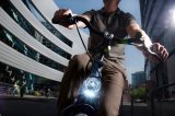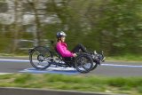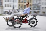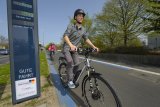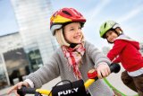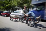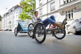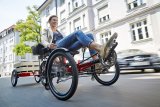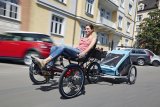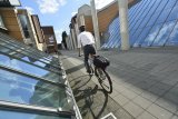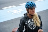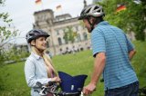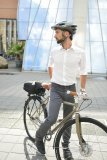 Zwei Personen fahren in dieselbe Richtung auf Fahrrädern durch die Stadt ? eine auf der Fahrbahn und eine auf dem geteilten Fuß- und Radweg.