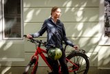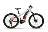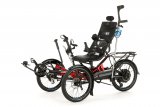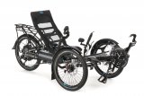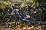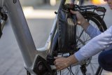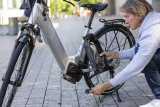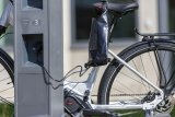 Ein Fahrrad mit Anhänger an einem Abstellbügel. Im Bereich der Stellfläche liegt weniger Schnee als daneben.