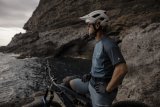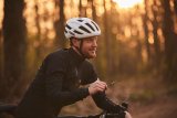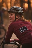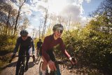 Ein Gruppe Radfahrender auf einem Waldweg.