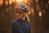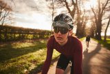 Ein Kind nimmt etwas aus der Hand eines Mannes, der vor ihm hockt. Beide tragen orange Fahrradhelme.