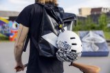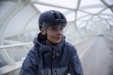 Ein Mann hantiert am Helm eines Kindes.
