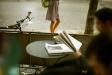 Blick auf einen Rucksack, getragen von einer Radfahrerin, die scheinbar gerade ihr Fahrrad abstellt.