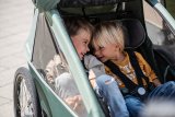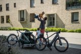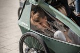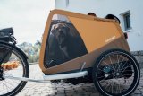 Eine Frau fährt auf einem blauen Lastenrad mit einem gelben Getränkekasten auf der Ladefläche über eine Brücke in der Stadt.