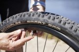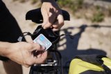Eine Person hantiert an einer Satteltasche eines Fahrrades herum.