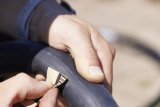 Detailaufnahme einer Person, die einen Flicken auf einen Fahrradschlauch klebt.