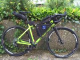 Eine Person tippt mit dem Finger auf das Display eines Smartphones oder Navigationsgeräts in einer Klarsichthülle auf dem Deckel einer Lenkertasche eines Fahrrades.