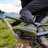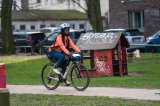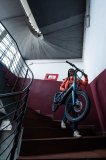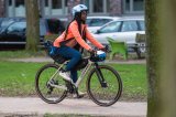 Eine Frau fährt auf einem blauen Lastenrad mit einem gelben Getränkekasten auf der Ladefläche über eine Brücke in der Stadt.