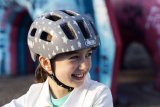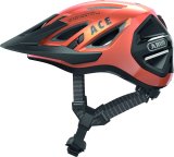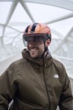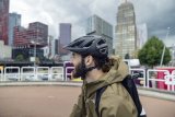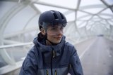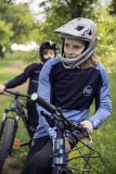 Ein Junge mit Fullface-Helm lehnt auf dem Lenker eines Mountainbikes und schaut sich um.
