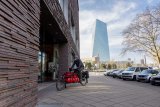 Frau fährt mit E-Bike durch Berlin