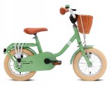 Ein grünes Fahrrad in klassischer Schwanenhalsform mit beigen Reifen, Lenkergriffen und Sattel.