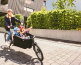 Eine Frau fährt ein E-Lastenrad mit einem Kind auf der hinteren Sitzbank.