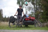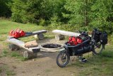 Fahrrad mit langem Gepäckträger und Anhänger mit Kartons