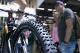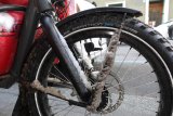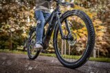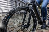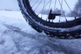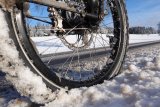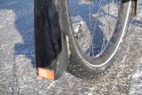 Bild des Hinterrades eines Fahrrades, dass durch eine Pfütze fährt. Vom Reifen spritzt Wasser.