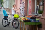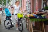 Frau fährt mit Lastenrad in der Stadt