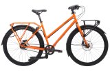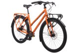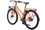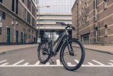 Frau fährt mit E-Bike in Stadt