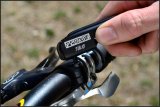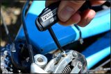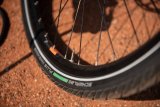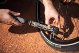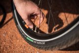 Eine Person drückt mit dem Daumen einen Fahrradreifen etwas ein.