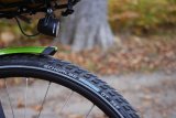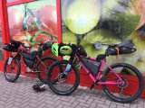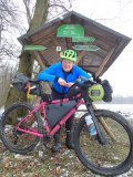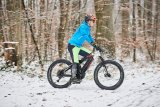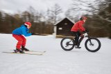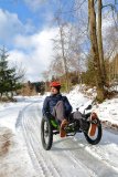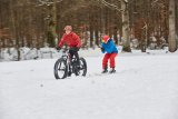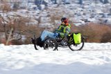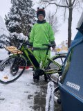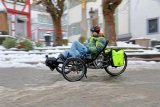 Ein Mann in einem Frosch-Kostüm fährt auf einem Fahrrad mit Kinderanhänger auf einer schneebedeckten Fahrbahn.