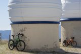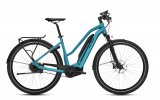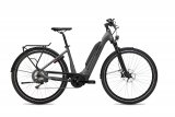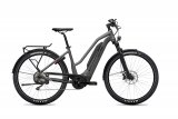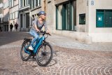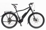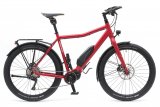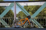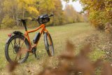 Ein orangefarbenes E-Bike mit Schnee in den Rädern und am Rahmen steht an eine Wand gelehnt.