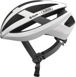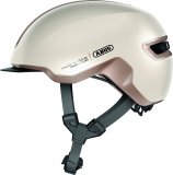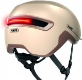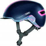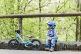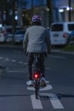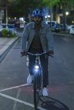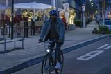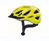 Eine Person präsentiert einen Fahrradhelm in Neongelb.