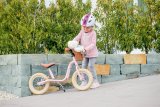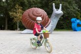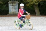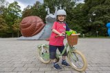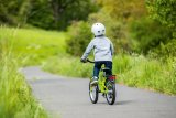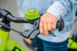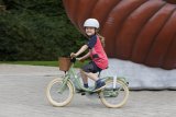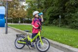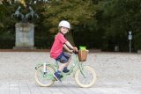 Ein Kind sitzt neben einem grünen Kinderrad auf einer Bordsteinkante.
