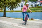Ein Mann und ein Kind fahren auf Fahrrädern einen gepflasterten Weg entlang.