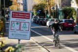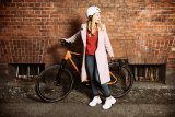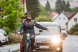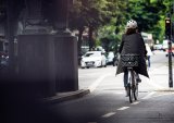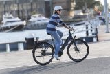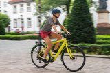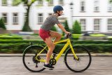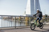 Ein Mann fährt auf einem Kompakt-Fahrrad durch die Stadt.