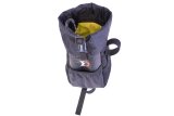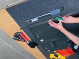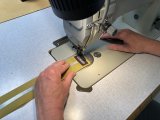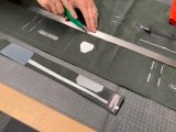 Eine Person schneidet mit einem Arbeitsmesser und einem Metalllineal Materialien einer Fahrradtasche.