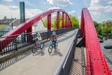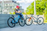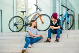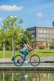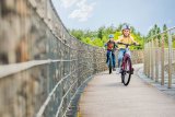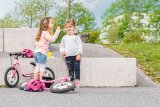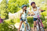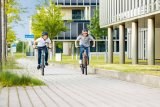 Zwei Kinder fahren auf Fahrrädern einen Betonweg zwischen Rasenflächen entlang.