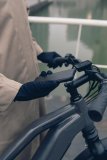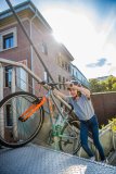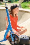 Ein Kind hockt neben einem Laufrad und malt mit Kreide auf dem Boden.