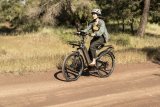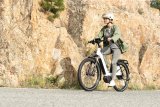 Eine Frau fährt auf einem E-Bike eine Straße bergan.