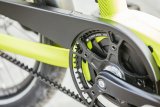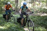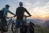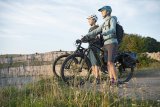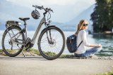 Eine Frau steht mit Fahrradhelm in der Hand an einem Gemüsestand auf einem Markt. Neben ihr steht ein E-Bike.